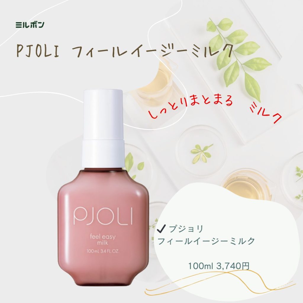 PJOLI フィールイージー ミルクは、純国産コメヌカ油とエンドウケラチンを配合したアウトバスミルクです。ベタつきを抑えながら、しっとりまとまり、やわらかな指通りに整えてくれるのが魅力です。